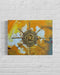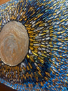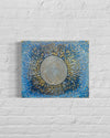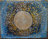 24”x18” acrylic painting of a radiant sun. This brightly colored painting features different metallic paints layered on top of each other which reflect in the light.